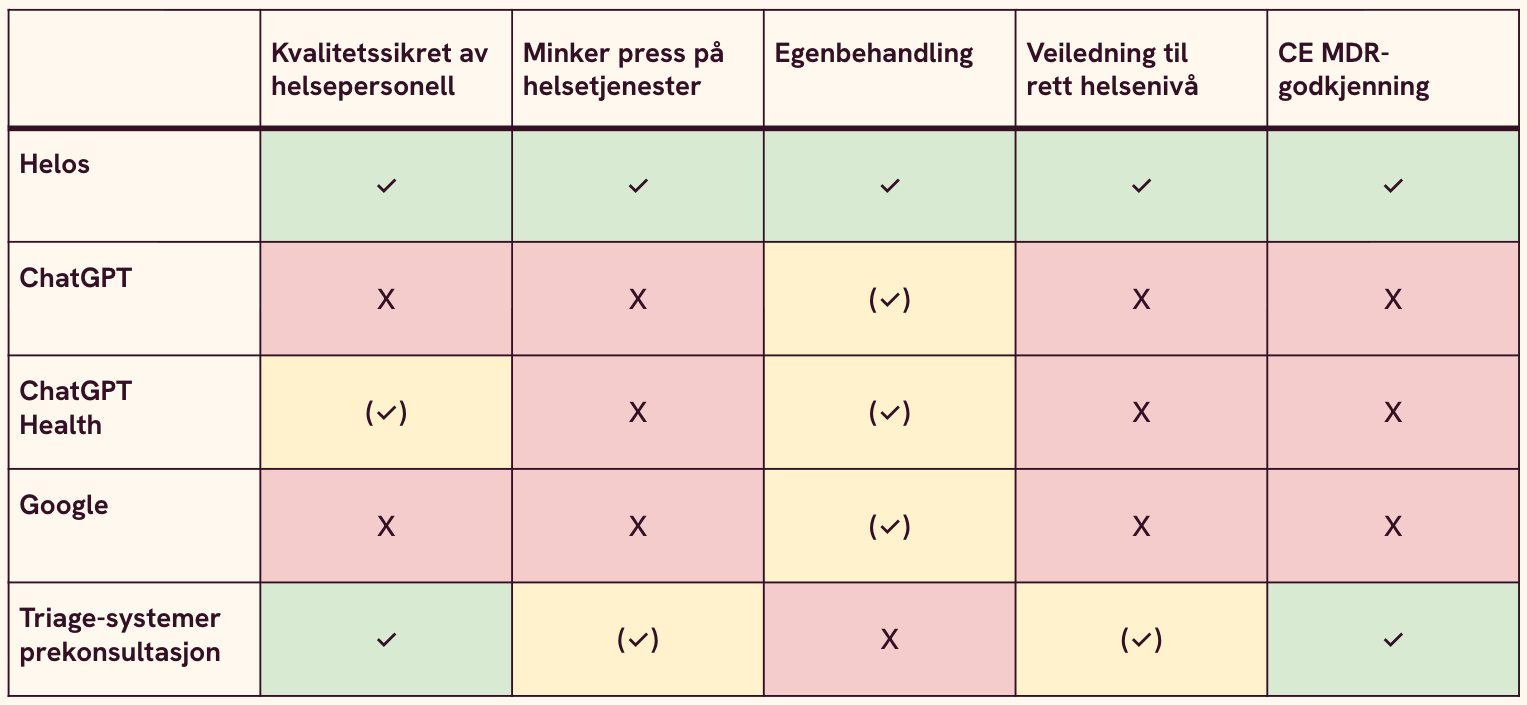 Trygg digital helserådgivning krever mer enn tilgjengelighet. Det krever medisinsk kvalitetssikring, strukturert vurderingslogikk og regulatorisk etterlevelse. Helos kombinerer disse elementene i én helhetlig løsning, noe dagens alternativer ikke gjør alene.